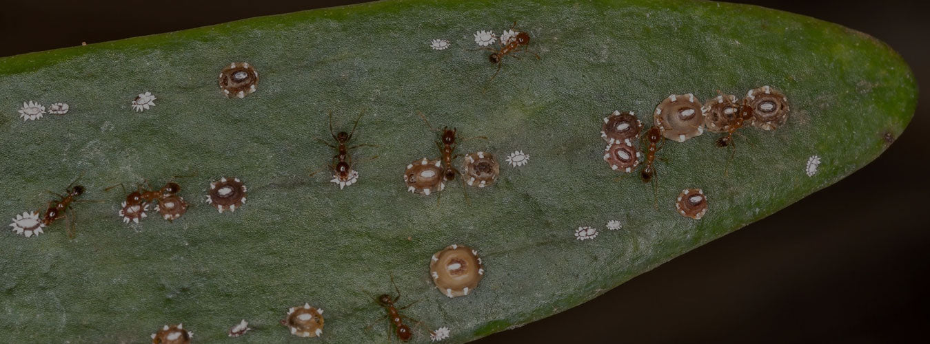 Scale insects feed sap from plants through piercing-sucking mouthparts. Sap feeding may cause leaf yellowing, premature leaf drop, stunting of growth, or twig dieback when infestations are heavy. Soft-scale insects excrete a sweet, sticky substance onto leaves called honeydew. Honeydew attracts insect scavengers like ants and may encourage sooty mold. Sooty mold is a fungus disease that grows on plants and covers the leaves resulting in less photosynthesis to provide enough energy for plants.